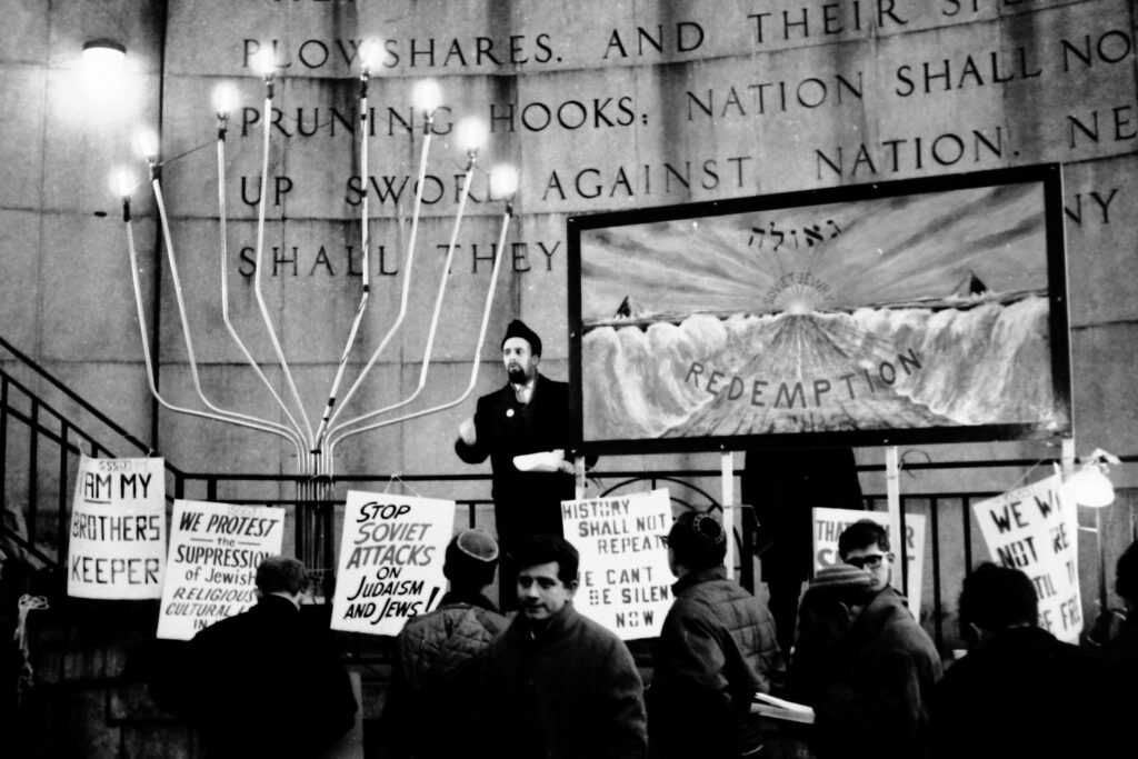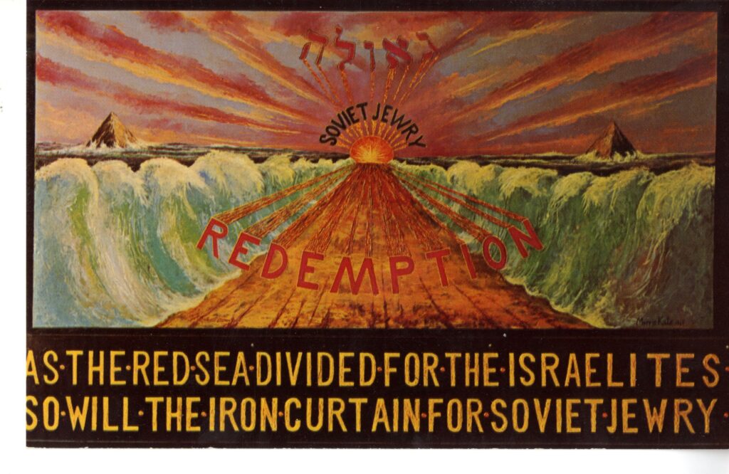 SSSJ demonstrations typically took place near the United Nations. SSSJ always obtained all the proper permits, and the rallies were legal and well-organized, a lesson that peaceful protest is powerful. Students marching in the Geulah - Redemption Passover vigil in 1966 paraded with a mural painted by Morris Katz for SSSJ for the event. The mural depicted the parting of the Red Sea, and equated the Soviet Union of the 1960s and its treatment of Jews with ancient Egypt and the enslavement of the Israelites.